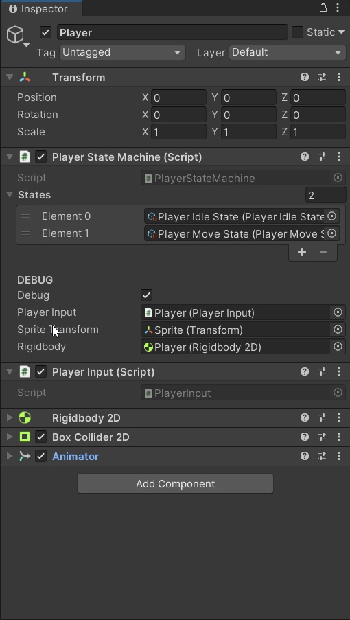 Once you create the scriptable objects for Idle and Movement, select your Player GameObject. Add a PlayerStateMachine component. Drag the scriptable objects on the “ States” field. Aso drag the other required fields like so: